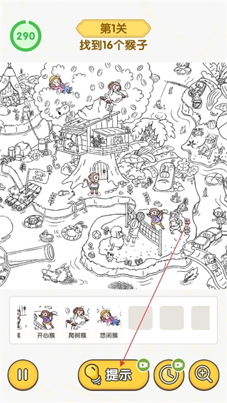 3、收集到猴子后,下方会显示对应猴子的类型,比如开心猴、爬树猴之类的;要是不好找,还能点击提示按钮来获取辅助线索。
