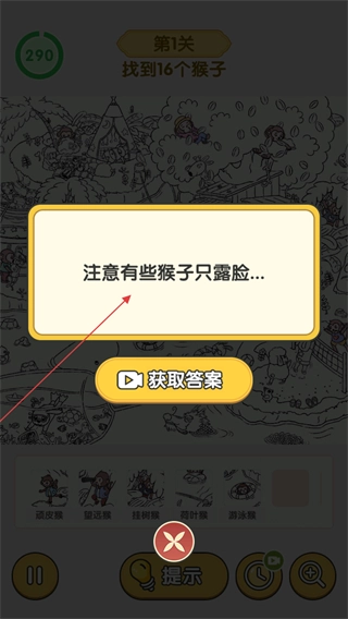 4、当出现提示弹窗提到部分猴子仅露脸时,要留意场景里那些只露出面部的猴子,也可以借助获取答案功能查看更清晰的提示。