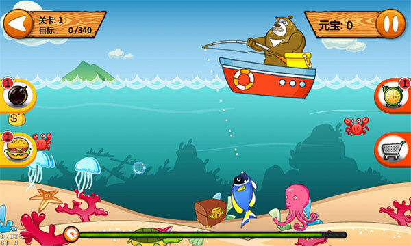 3、依据吊钩的朝向,轻点屏幕就能放下吊钩,一旦触碰到任意一条鱼,便会自动拉钩。要是不小心钓到了凶猛的鲨鱼,务必使用炸弹将其炸掉。点击小闹钟,就能增加游戏时长。吃汉堡能够为我们补充能量,加快上鱼的速度。