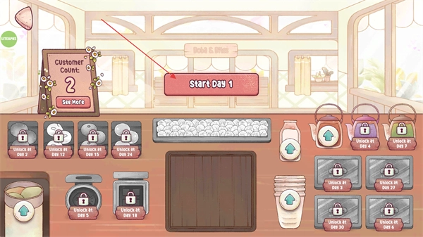 3、进入Bistro的经营准备界面后,点击屏幕中间的按钮,就能开启首日的经营工作,开始处理顾客的订单需求。