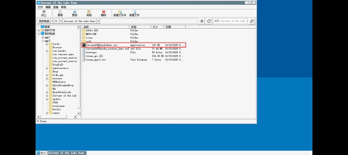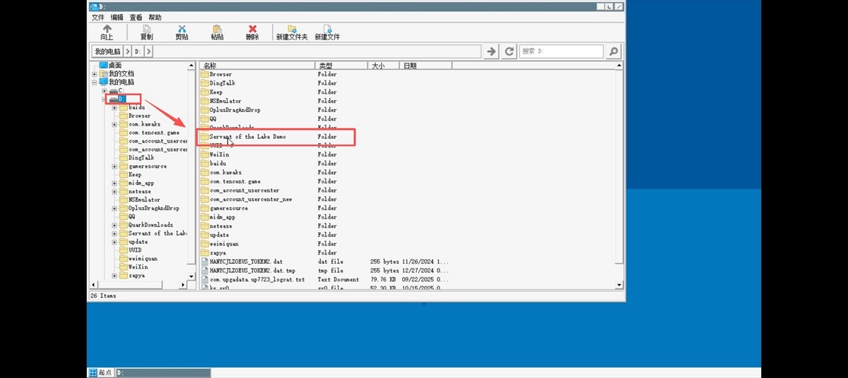 成功启动后,找到D盘下的“Servant of the Lake Demo”文件夹。