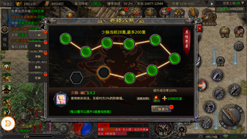 督脉:等级上限20级,1级内包含10重,每提升一重可增加0.5%的HP与0.5%的减角伤害;此外,每累计提升5重还能额外增加1点准确。升级所需材料为督脉·根骨丹。
