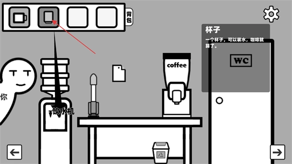 3、在当前场景下,点击背包内的杯子,能通过饮水机完成装水操作,此物品可在后续相关交互环节中使用。