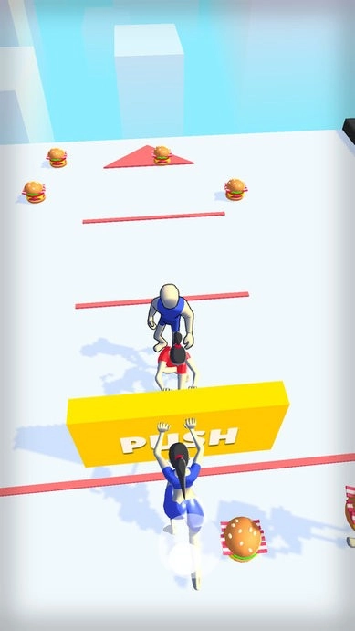 玩家操控角色去收集散落在各处的汉堡,两位小姐姐在场地中间互相推搡着板子,地面上设有分界线,玩家需要用收集到的汉堡来帮助小姐姐们增强身体力量。