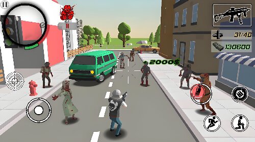 3.不断的消灭敌,利用汽车碾压僵尸,使用武器射杀僵尸,获得更多的奖励,将自己的装备进行升级。