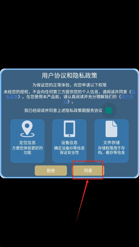 1、首先,阅读用户协议和隐私政策,然后点击“同意”按钮以继续。
