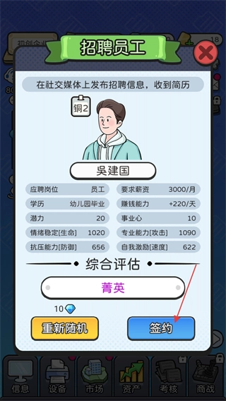 2、进入招聘员工界面后,找到综合评估等级为菁英的吴建国,点击签约录用按钮完成操作。