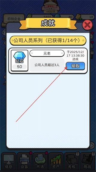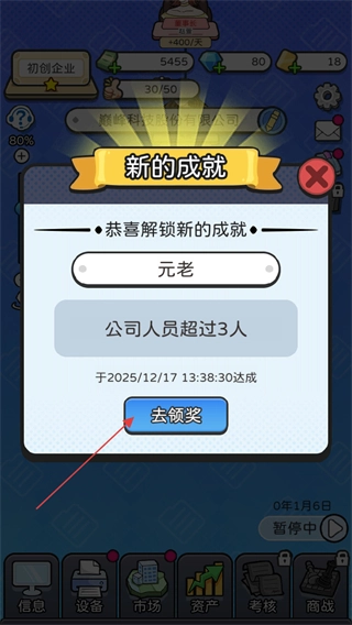3、当公司人员数量超过3人时,会触发元老成就,点击“去领奖”即可进入成就界面。