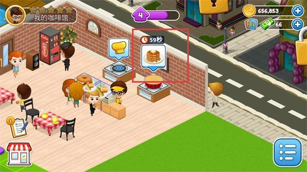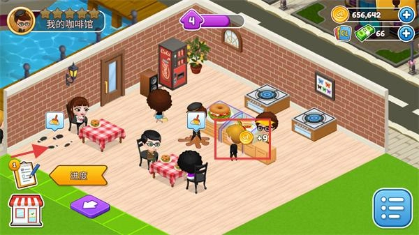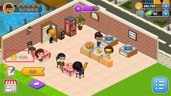 在经营界面,顾客完成消费后能得到金币,点击【进度】按钮可以查看任务的推进情况。