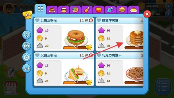 3、进入菜品界面后选择【蜂蜜薄烤饼】,制作这道菜品需要消耗【10-紫币】和【12-金币】,所需的制作时长是1分钟。