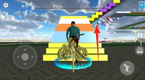 操控自行车,顺着箭头指示的方向【骑行至彩色阶梯上】,注意维持平衡,防止香蕉掉落。