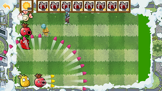 要点2:三管豌豆属于自动持续攻击型植物,无论场上是否有敌人都会保持攻击状态。建议将其布置在第2行和第4行的靠后位置。