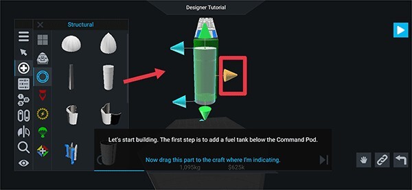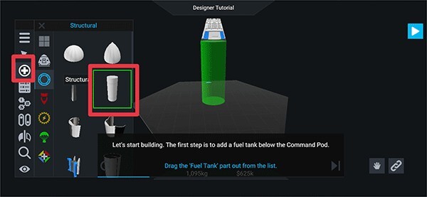 3.进入后,按照提示操作,在指挥舱的下方添加一个燃料箱。点击加号按钮,然后从“structural”分类里挑选合适的部件。