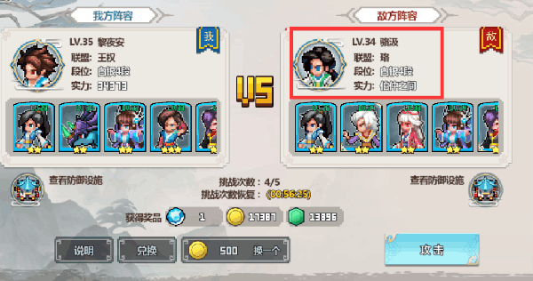 进入后看到的是敌我双方的基本资料,红框内标注着对方的等级、名字、段位等信息。这里需要重点说明的是“实力”这一项——虽然没有直接显示对方的战斗力数值,但会用文字来描述,具体分为三种:江湖虾米、伯仲之间、高不可攀。相信大家看到这些描述就能大致明白含义,通常建议先选择“江湖虾米”级别的玩家对战,接着再挑战“伯仲之间”的;如果想尝试突破自己,也可以选择“高不可攀”的对手。Ps:要是遇到实在打不过的情况,界面里还有一个用500灵币兑换新对手的选项。