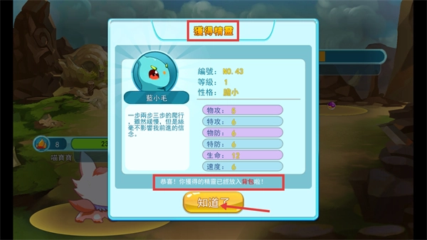 4、成功捕获精灵后,系统会弹出【获得精灵】界面,在此可以查看【蓝小毛】的属性信息,点击【知道了】按钮即可结束当前流程,并将【蓝小毛】存入背包中。