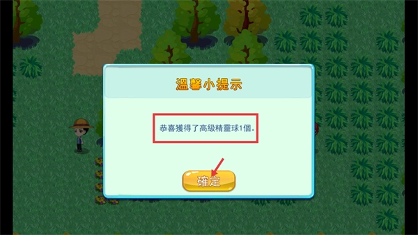 2、拾取道具后会弹出【温馨小提示】,提示获得【高级精灵球1个】,点击【确定】按钮就能把该道具收入背包。