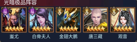 这套阵容的核心围绕光、暗魂系构建,能收获丰厚的组合属性加成;输出端由蚩尤与金翅大鹏担当主力,爆发力强劲;辅助方面则配备了白骨夫人和观音两位强力角色,兼顾治疗与增益效果。整体阵容输出稳定且续航充足,实战中相当棘手。