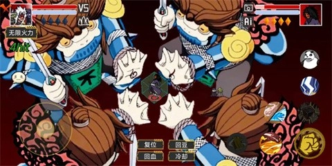 之后玩家可以选择自己与AI对应的角色、忍卷和通灵兽,也能点击问号按钮进行随机选择,选好后点击开始就能进入游戏。
