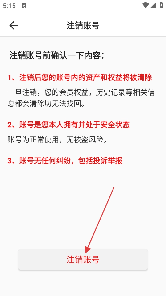 4、进入确认界面后,请先仔细阅读注销须知,随后点击【注销账号】按钮,即可提交账号注销申请。