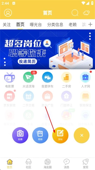 1、进入滨海论坛首页后,找到页面右下角的黄色“+”按钮并点击,随即会弹出功能选项菜单。