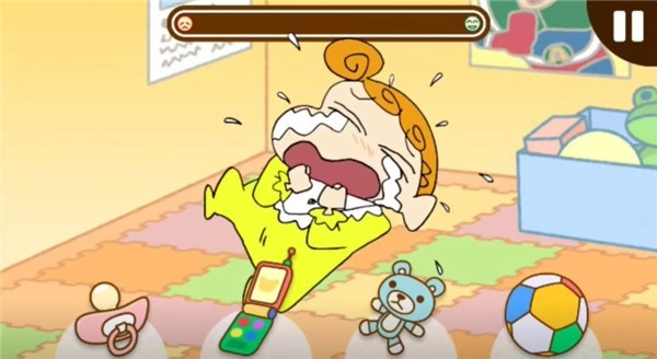 作为一个合格的哥哥,你点击安抚奶嘴并递给小葵,小葵就停止哭泣了,还冒出了红色爱心。要留意头上的进度条,得让它达到百分之百才行。