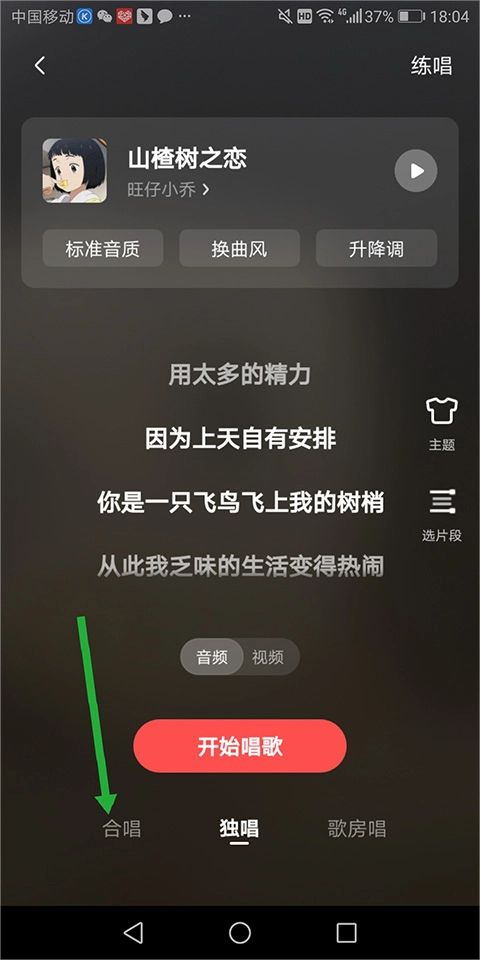 2、在弹出的新页面里,点击底部的【合唱】按钮(即下图中绿色箭头标注的区域)
