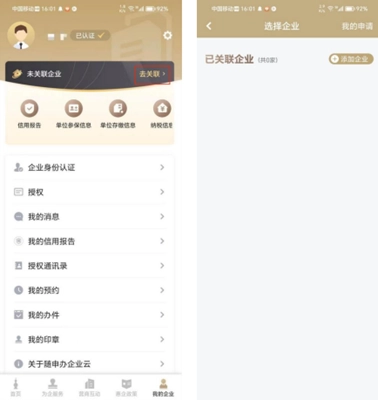 2、进入“我的企业”页面后,点击“去关联”或“切换”按钮,即可跳转至“选择企业”页面。