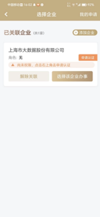 4、勾选目标企业后,点击“选择企业”按钮,就能完成企业添加操作,之后需通过申请认证来完成角色绑定。