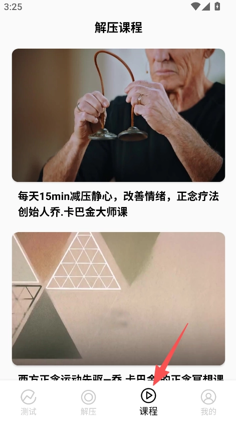 3、界面功能分区清晰明了,“课程”“解压”“测试”三大板块划分明确,用户能够迅速定位到所需的减压资源,整体操作流程便捷且高效。