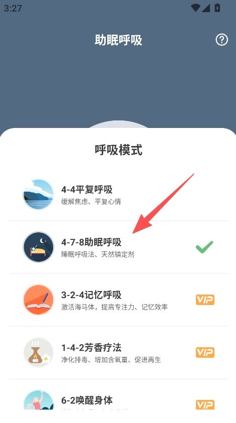 3、找到助眠呼吸模式,挑选像4-7-8助眠呼吸这类模式,就能开启助眠呼吸练习。