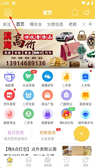 1、在滨海论坛首页,点击左上角的个人图标,即可进入个人页面。