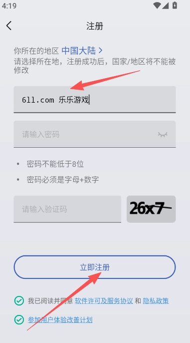 2、选择所在国家或地区,输入密码、数字验证码等信息后,点击“立即注册”按钮。