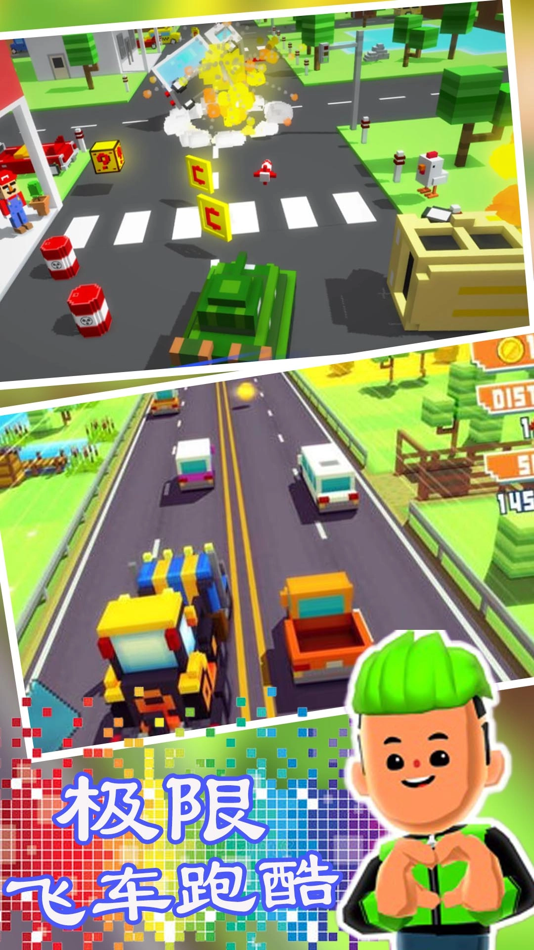 1、这是一款融合了竞速驾驶与飞车元素的休闲跑酷游戏,置身于充满像素风格的飞车世界之中。