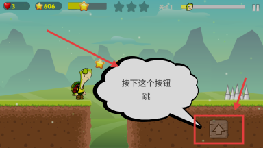 3、进入关卡后,一旦出现提示按下按钮跳的对话框,就点击界面里对应的向上箭头按钮,操控角色跳跃,越过障碍接着前行。