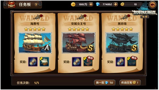 当大海战任务列表里没出现玩家心仪的船只时,玩家可以用钻石更换船只,也能使用战船召唤徽章直接召唤传说级别的船只来挑战,以此获取传说船只的碎片。