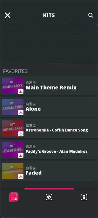 如图所示,左上角加粗的字体为音乐包的名字。寻找所需的音乐包只要点击KIT就可以找到列表。