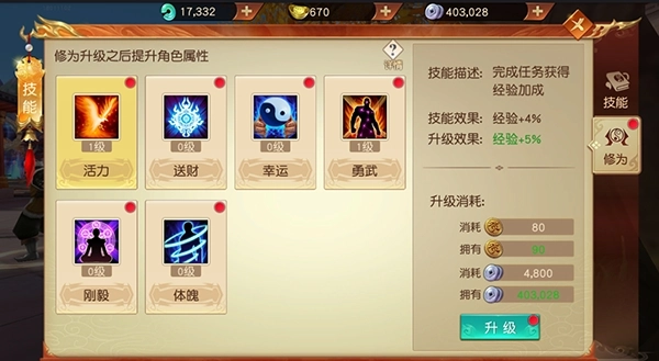 1、在主界面点击技能按钮,进入技能页面在上方找到“修为”系统按钮点击进入;