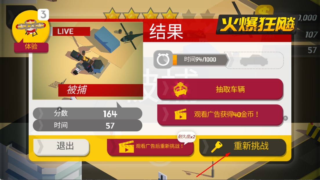 4、若被捕,可点击【重新挑战】,再次尝试,也可选择点击抽取车辆。
