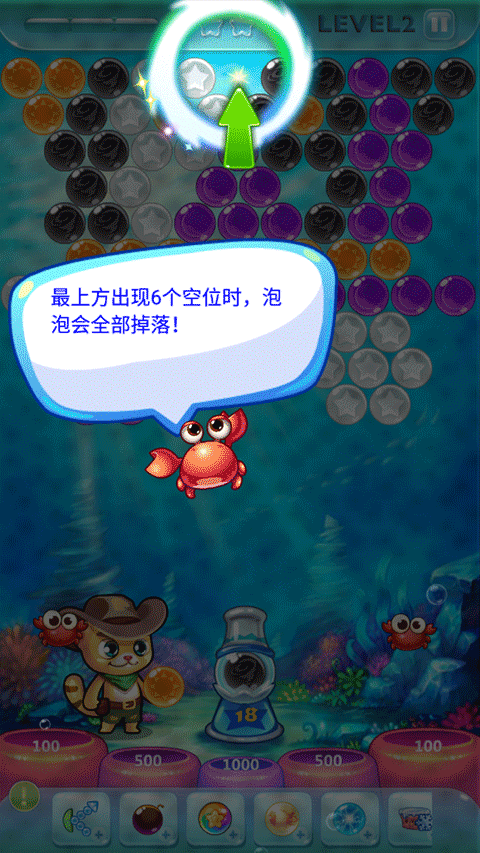 2、最上方出现6个空位时,泡泡会全部掉落!