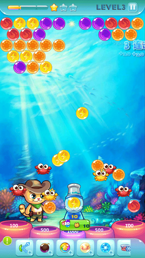 1、尽量快速地连续消除泡泡,善于观察局势并锁定最佳目标,利用技巧制造连锁反应。