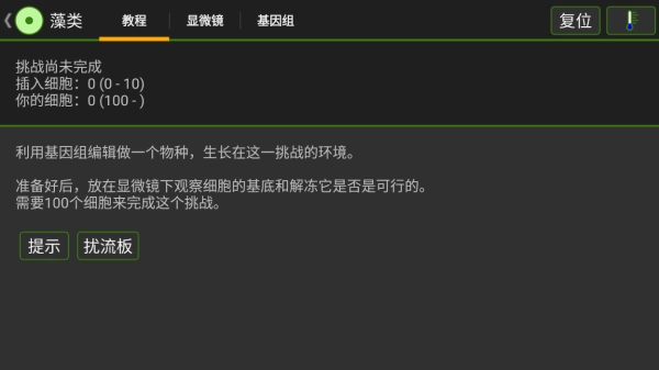 1、进入到细胞实验室里面以后,你们就可以开始一个挑战了,比如说你们去选择【藻类】,那么就可以正式开始游戏了。