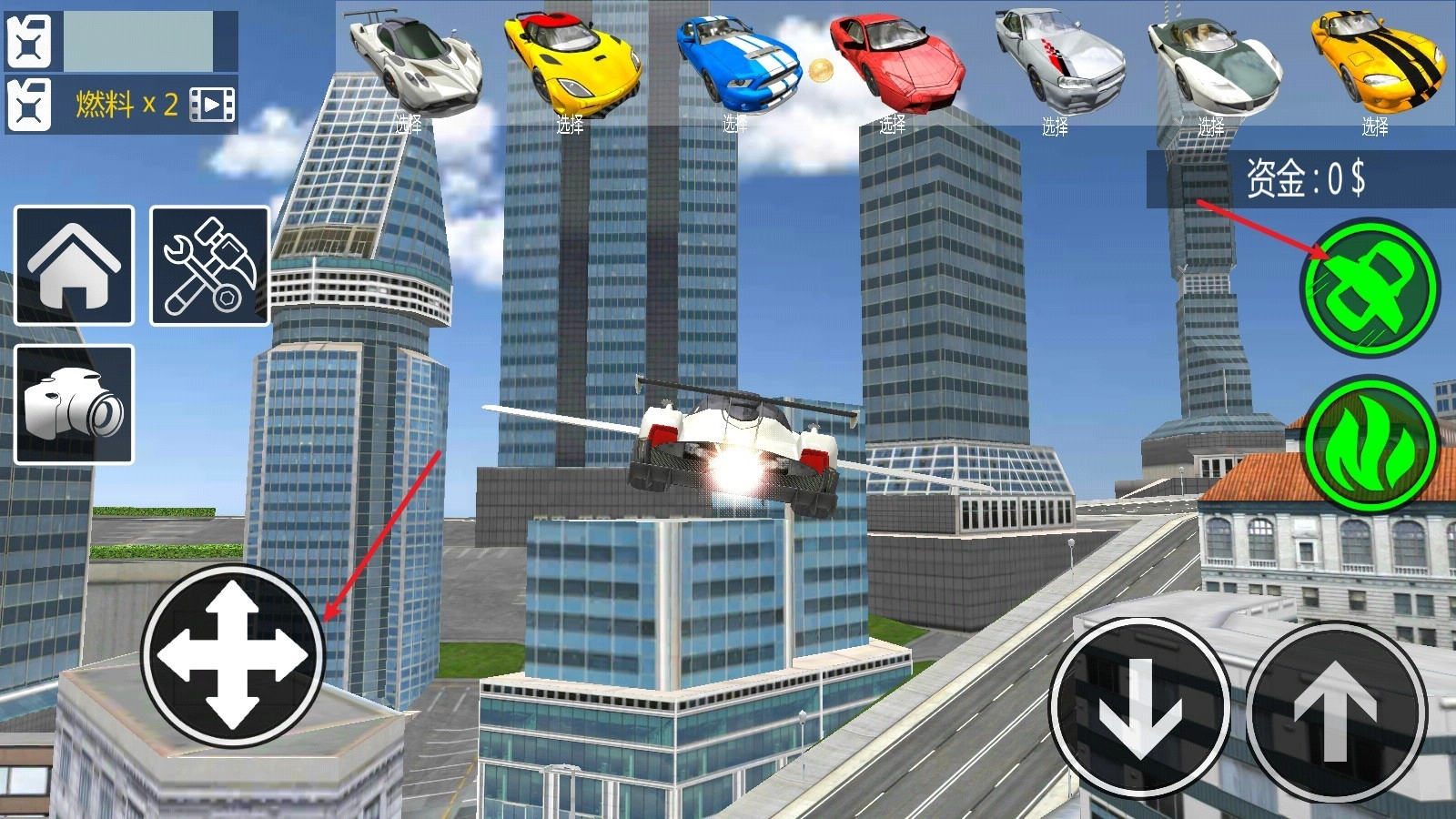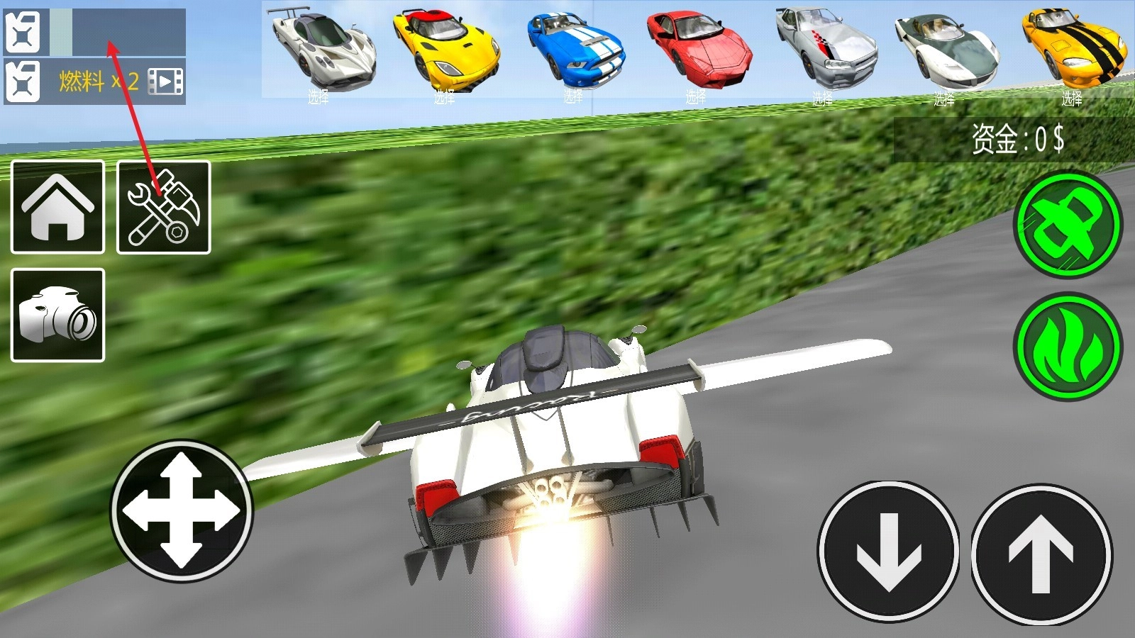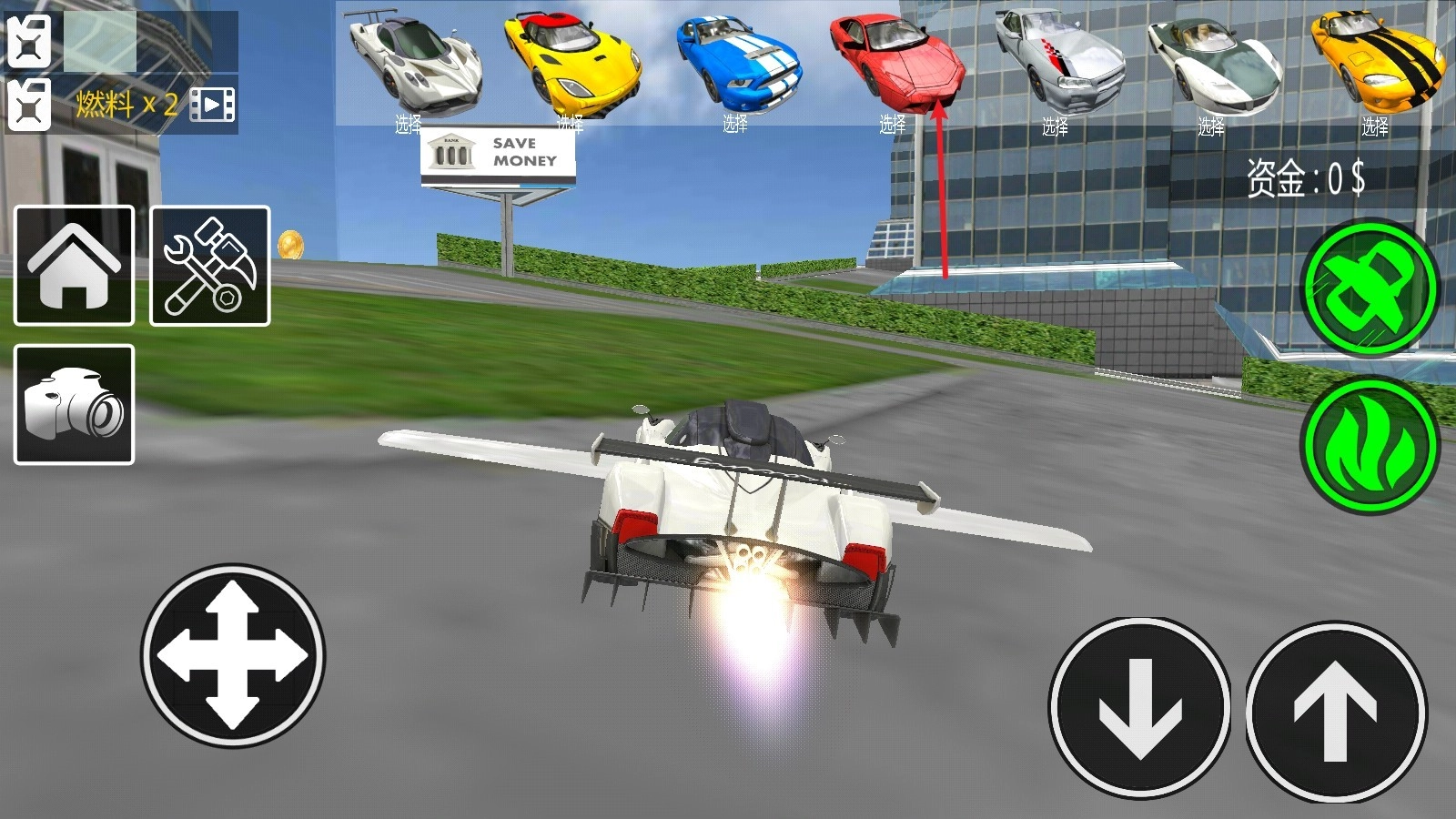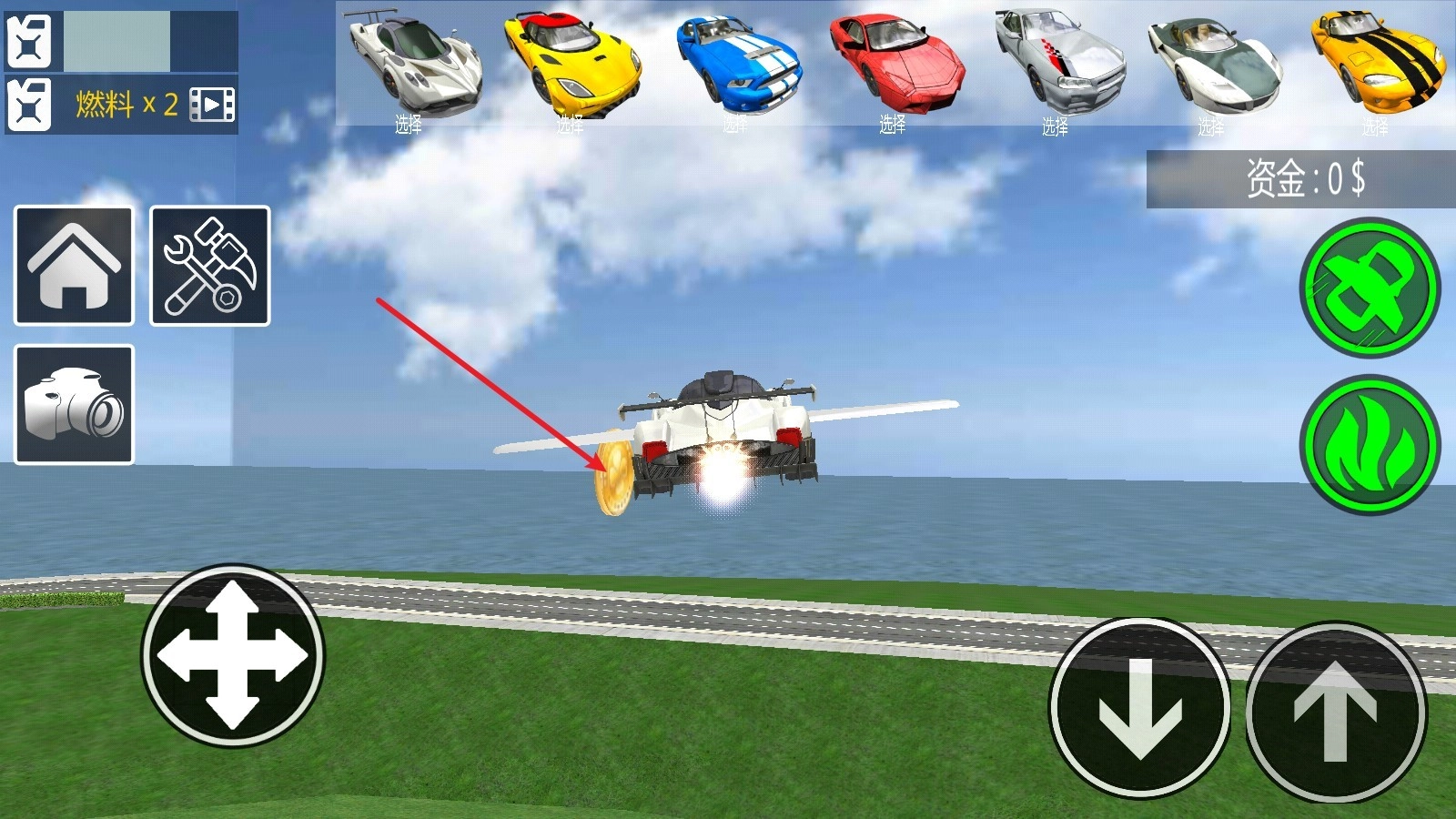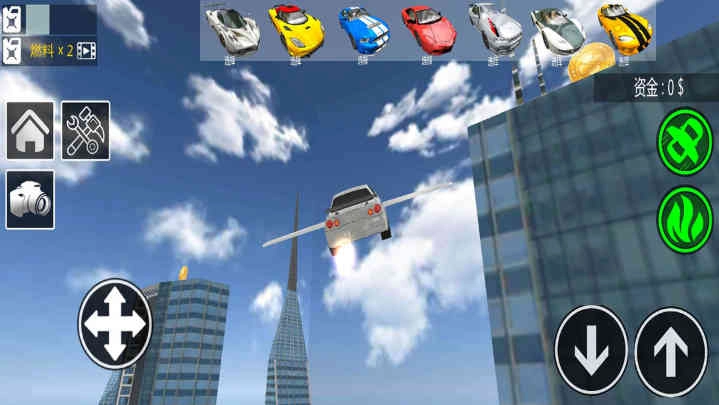 3、点击右侧机翼就能使其展开,随后汽车便可以实现飞行,借助摇杆就能操控飞行的高度与方向。