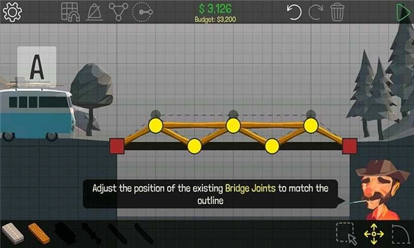 这一关卡是该系列里首次运用液压控制器的关卡。这座桥的右端要垂直降下2米,因此液压杆得有4米长。刚好下方有个红点,能将液压杆固定在这个位置。