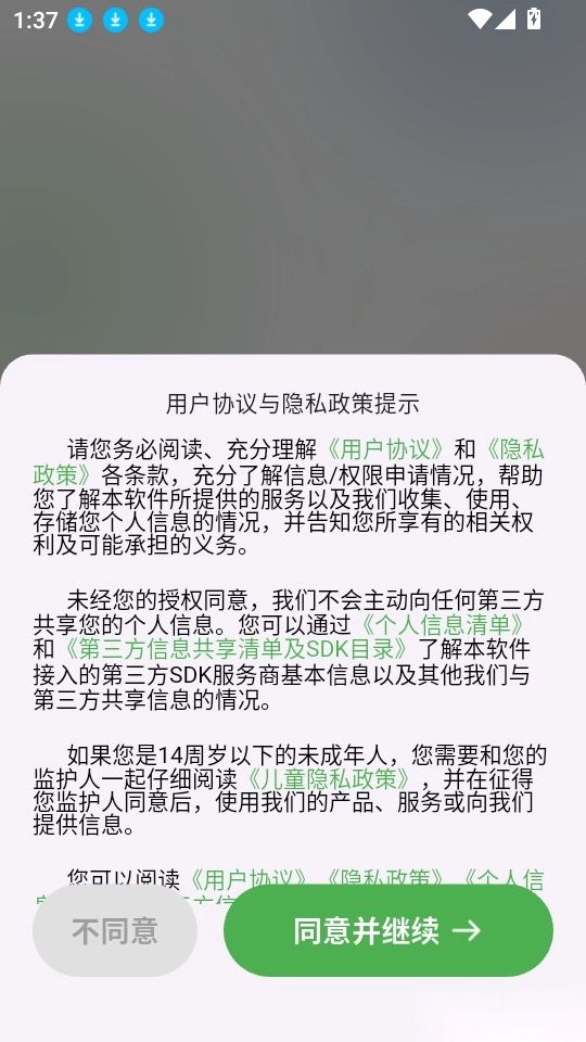 1、首先打开应用点击“同意并继续”按钮进入中。