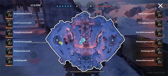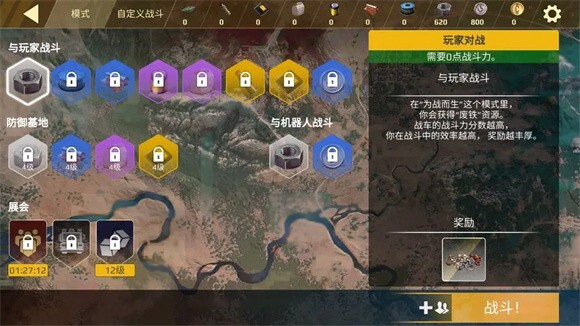 2、如下图所示,战斗选择界面主要分为四个部分:与玩家战斗、防御基地、与机器人战斗,还有乱斗模式的“展会”。一般来说,“防御基地”和我们传统理解的PvE比较接近,会定时刷新敌人,玩家需要保护指定的目标点。