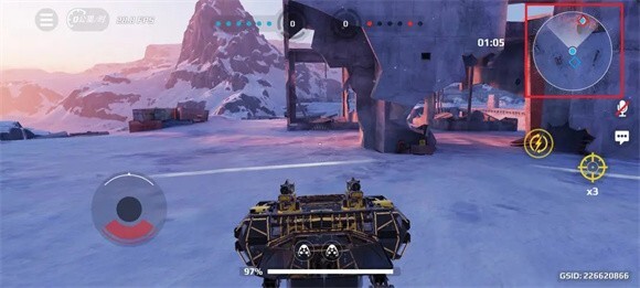 5、战场地图里会标注基地的位置,其中队友和敌方战车的位置分别用蓝色和红色圆点标示,黄色圆点代表自身所在位置。