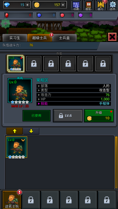 成长士兵是一款偏向经营玩法的策略类游戏,它结合了经营、合成、闯关、冒险等等多种元素,你将化身为一名军团指挥官,通过不断的招募、培训、合成士兵来征战每一寸土地,踏平所有你看到的关卡。游戏拥有士兵升级系统、科技研究系统等等,内容非常丰富。