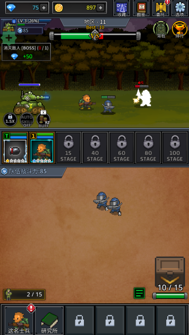 成长士兵采用像素画风,画面接受度高,自动战斗式的放置玩法也可以有效解放双手,操作难度低,玩起来非常轻松,当一款休闲游戏玩也蛮不错的。