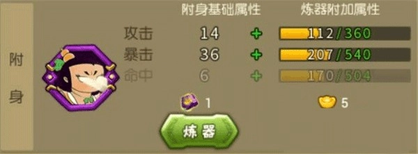 炼器符:法宝2星后娃娃附身可使用,随机增加1点法宝经验或者2-3点不等的附身加成属性(需激活法宝星级)。