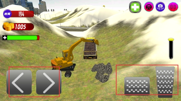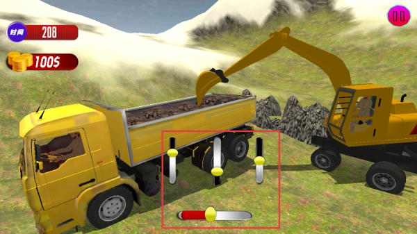 使用按键控制挖掘机装土,将运输车全部装满。